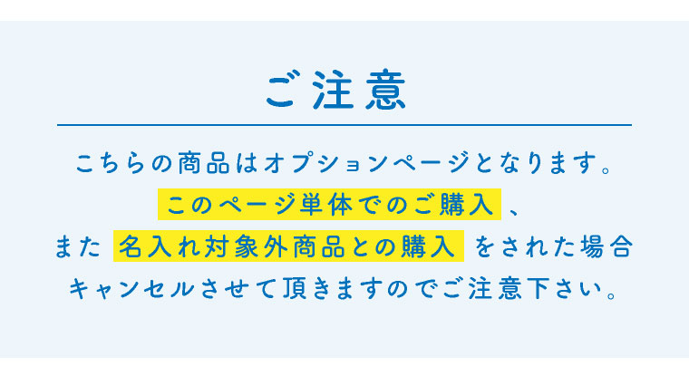 ・オプションのみのご注文、もしくは1商品に対して複数のオプションのご注文 ・対象アイテム以外と一緒のご注文 ・対象アイテムとオプションを別のお買い物カゴでご注文 ・対象アイテムを複数ご購入で、どの商品がオプションをご希望か分からないご注文 ※「オプション希望商品が分からないご注文」は、ご購入の際に「備考欄」がありますので、どの商品に対してご希望されるのかを、ご記入いただくことで発送可能になります。