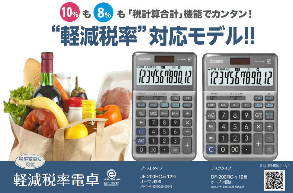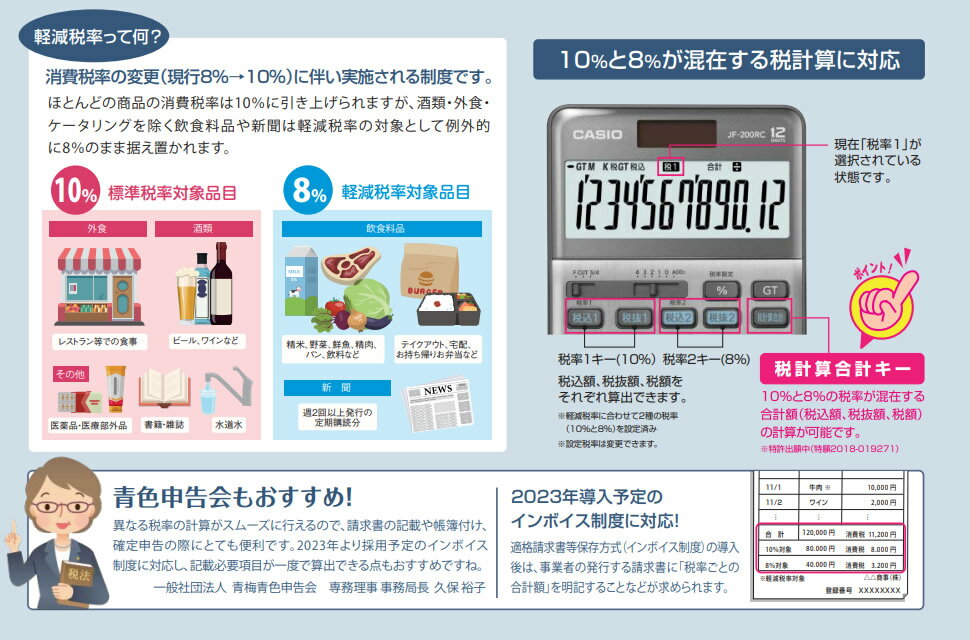 ■プラスチックキー ■オートパワーオフ ■メモリー数 2 特徴 本体に2つの税率キーと「税計算合計」機能の採用により、10%と8%の税率が混在する計算でも、税込総額・税抜総額・税総額の算出が可能です。